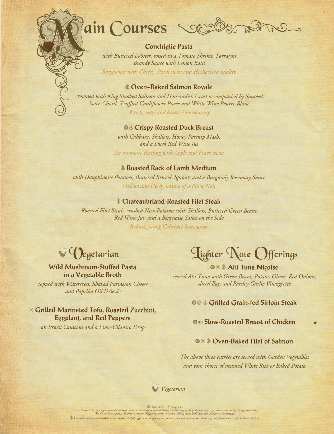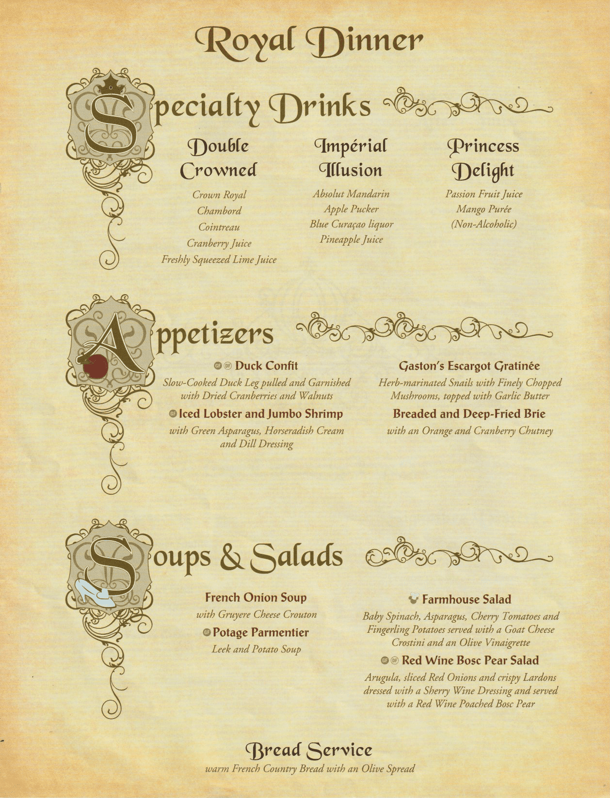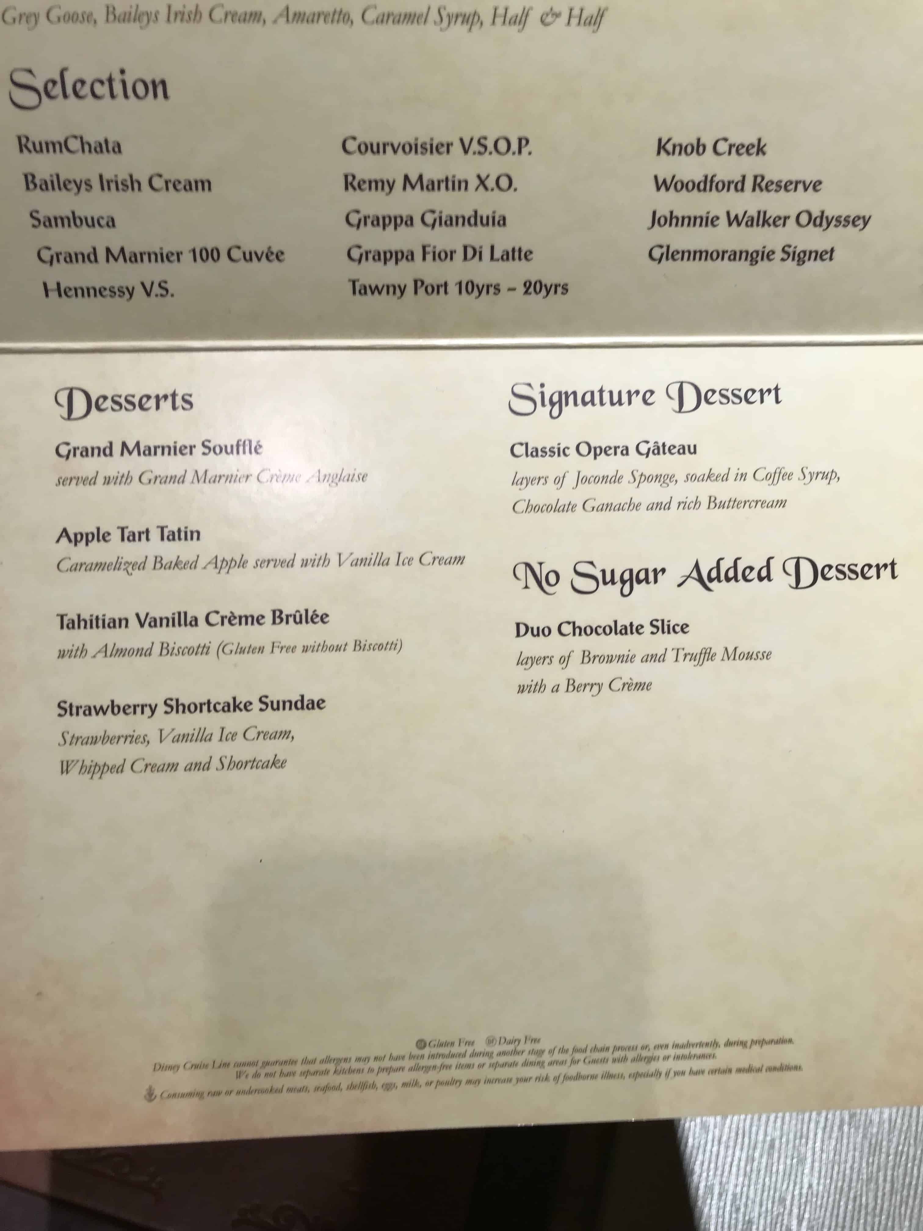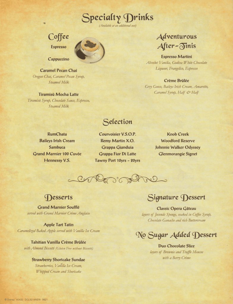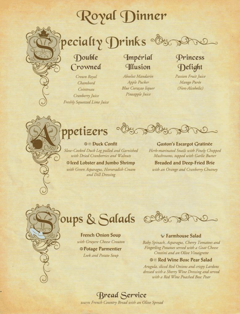 Here is the May 2022 menu (courtesy of Steven Weir) and some food items from Royal Palace on the Disney Dream. The food pictures are the same items from various other sailings.