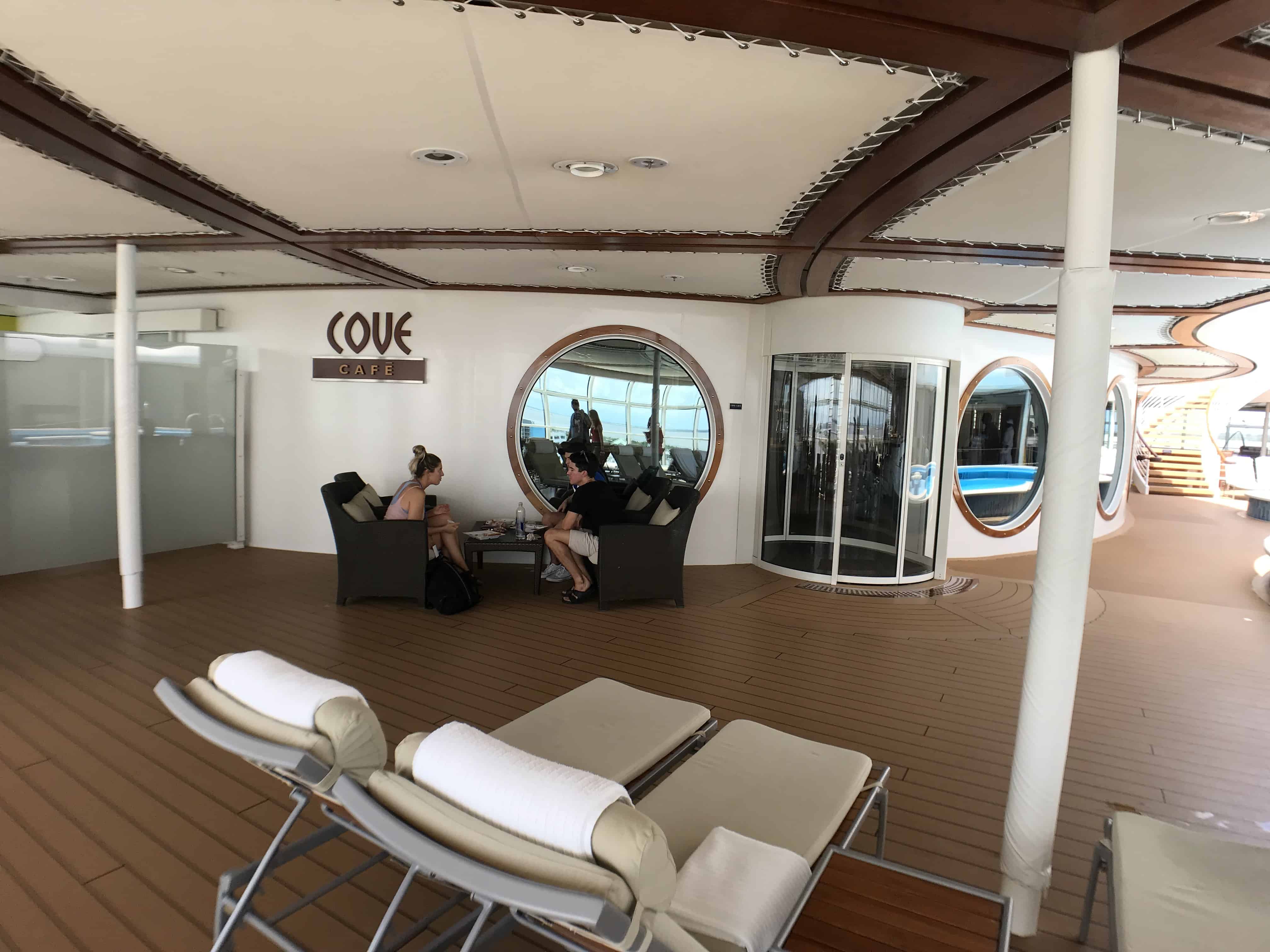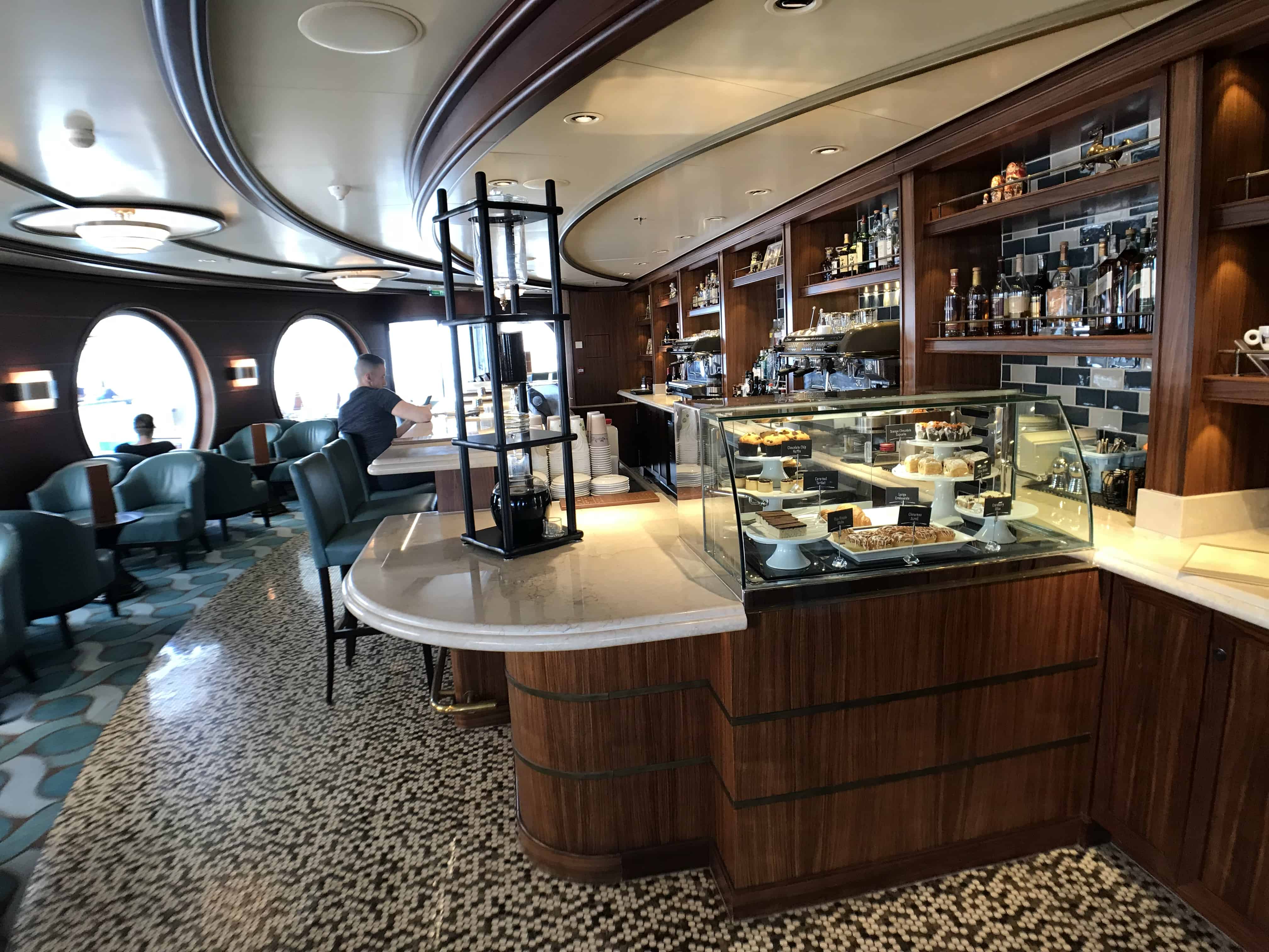 The Vista Cafe is located mid ship in the atrium on Deck 4, making it accessible to guests under the age of 18 with charging privileges. It features the same menu as the Cove Cafe. There are seats at the small bar as well as various seats throughout the atrium where you can enjoy your beverage.