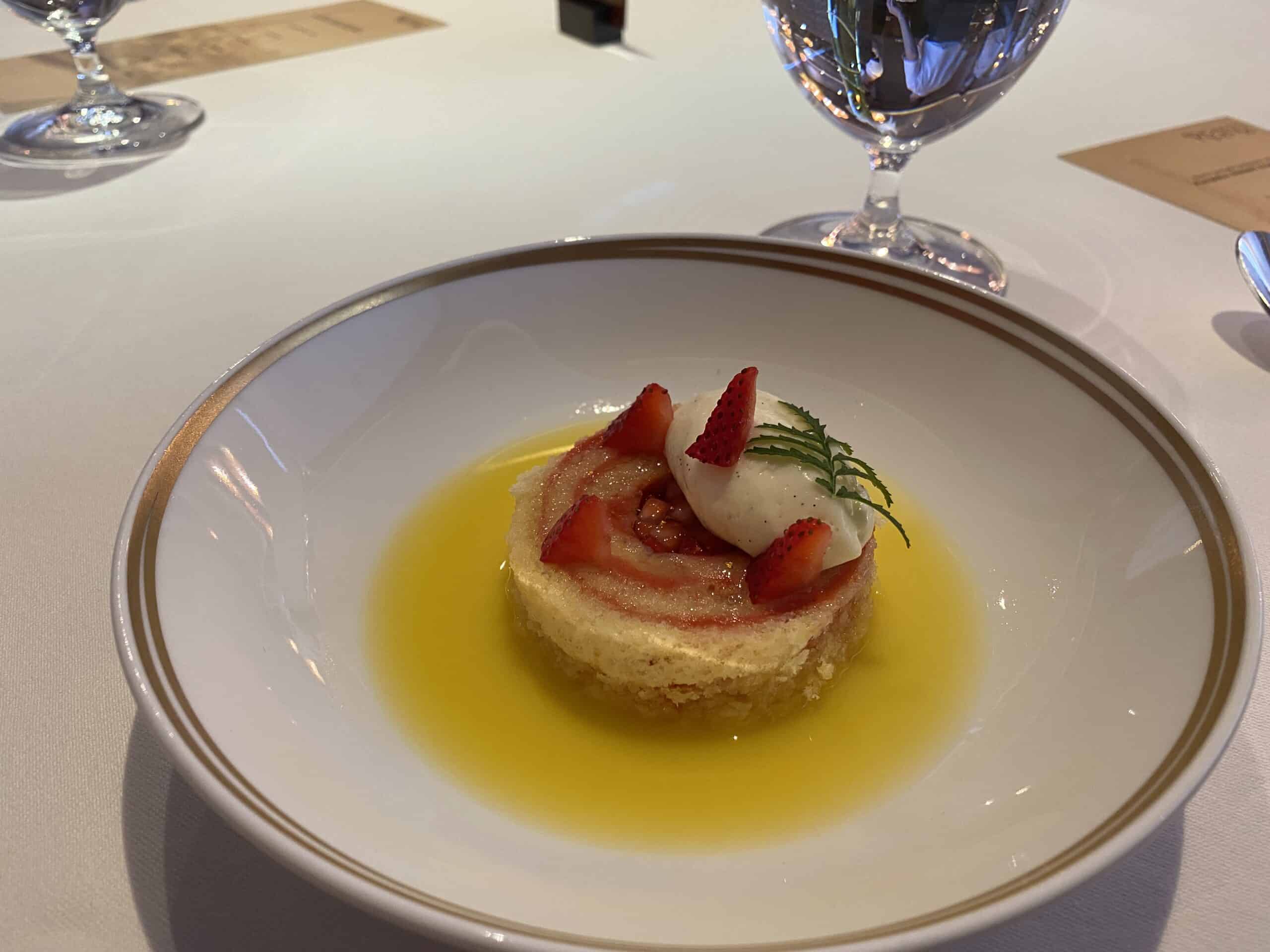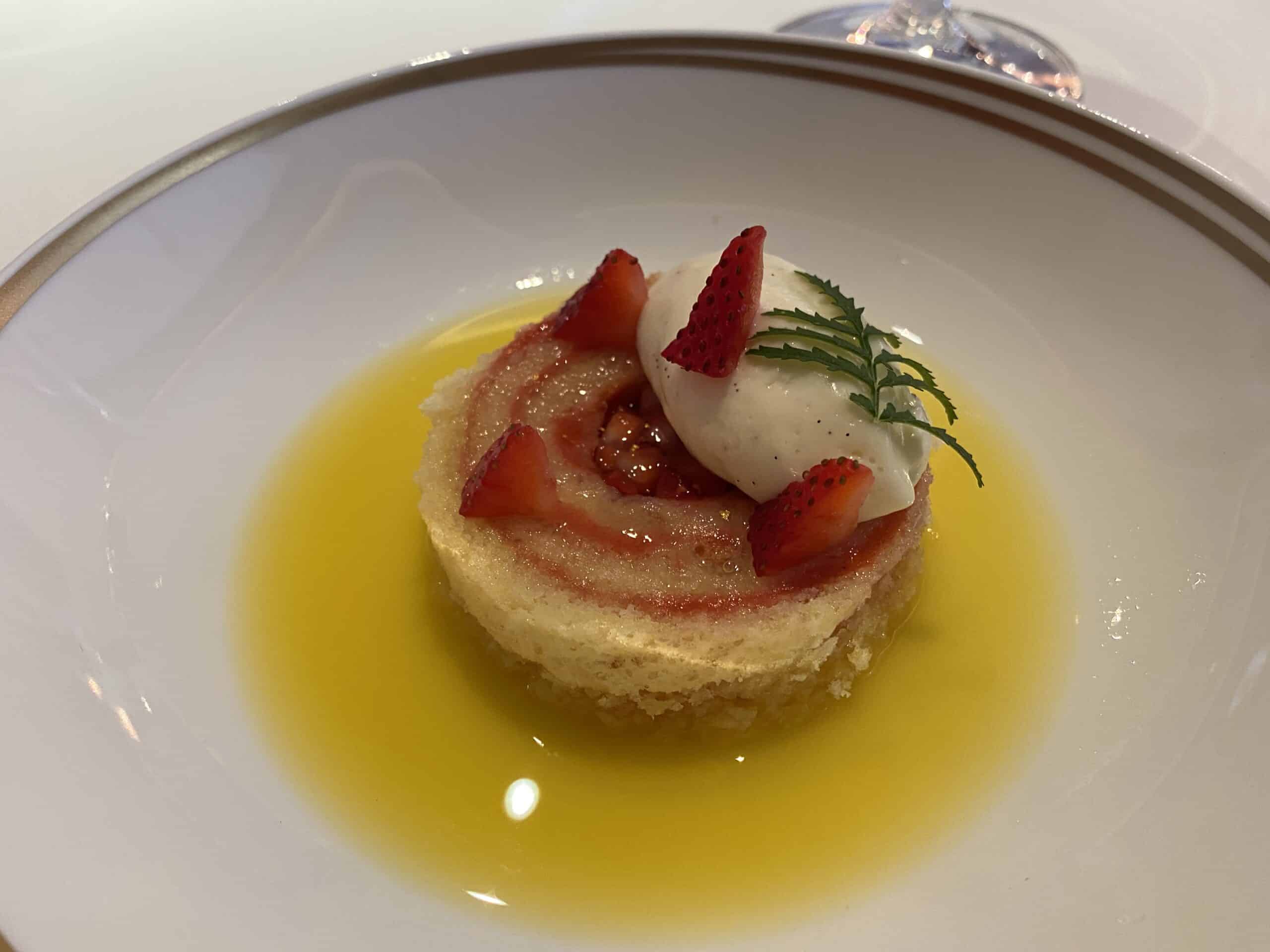 Our fourth corse was the Fraise Calamansi. This was a pinwheel type dessert with sponge cake and strawberry jelly, then it was served with syrup made from Calmansi, which is a lime that grows in the Philippines. It was really light and refreshing.