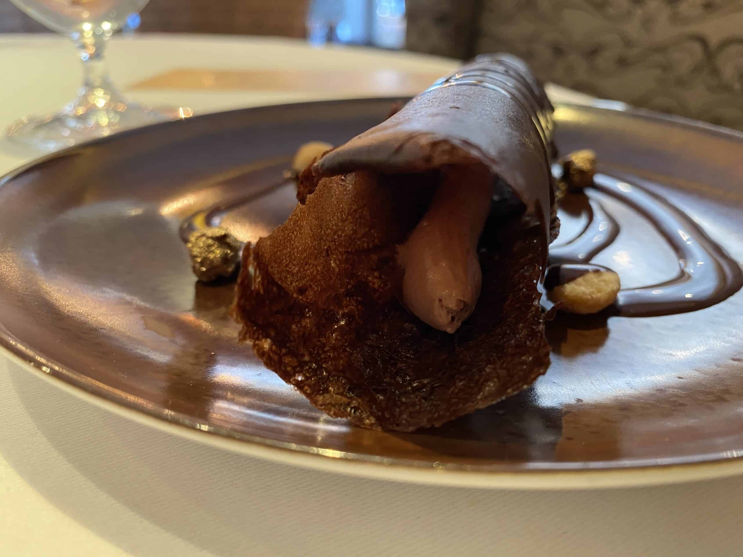 The fifth course was a Chocolat Croquant. This was a dessert that is made from a chocolate egg mixture that was almost like an overcooked crepe. Having said that, it was amazing. There was a peanut or hazelnut cream sauce in the middle of it that was delicious.