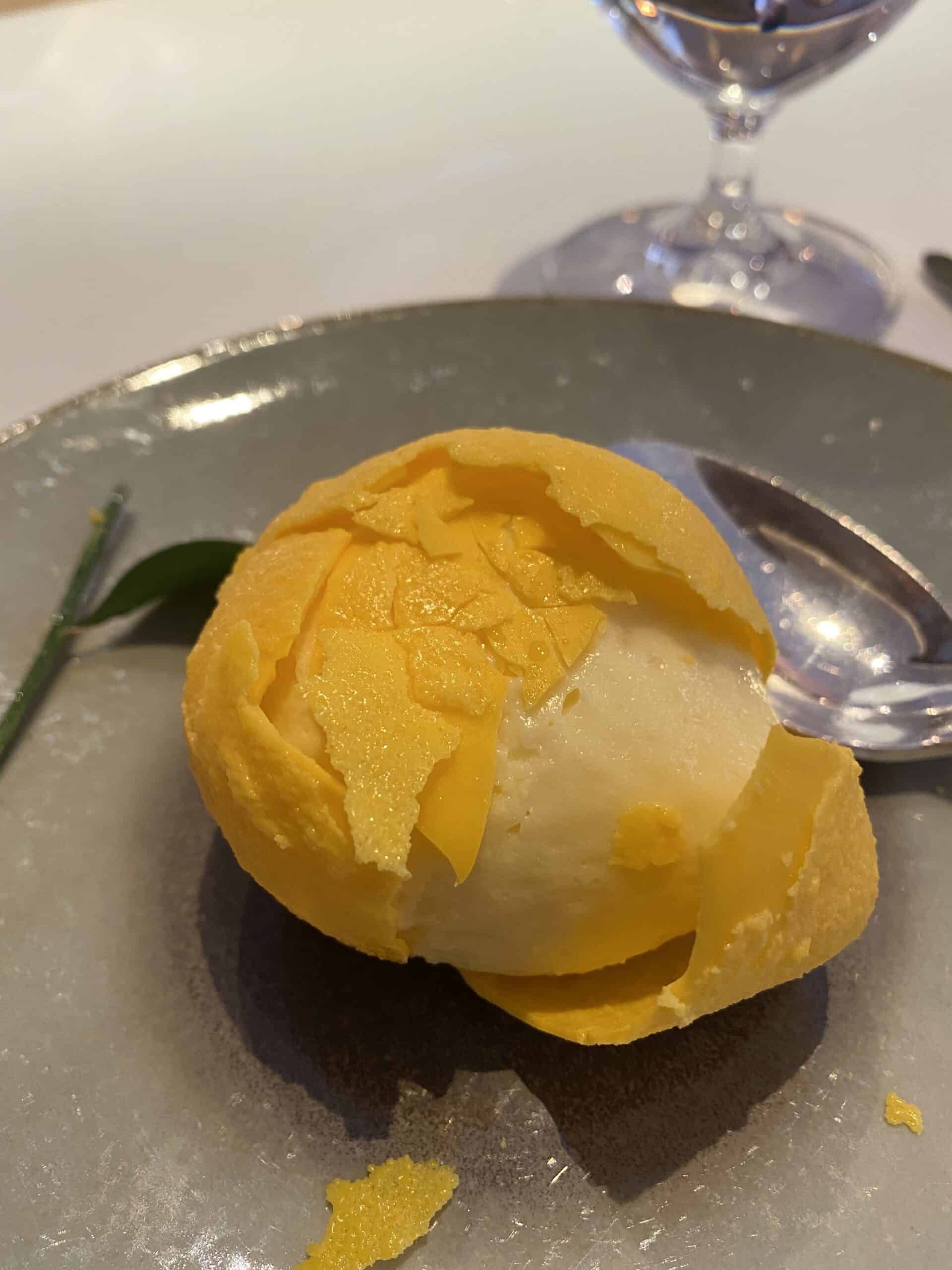 The last course (thank goodness, we were really full at this point) was the Citron. The chef described the hours it took to construct this dessert, including all the steps it took all the way down to making the “skin” of the lemon look correct. Inside the lemon shell (which was some sort of edible chocolate or candied lemon), was a lemon mouse. I loved the presentation of the dessert, but I’m not a huge fan of lemon overall.