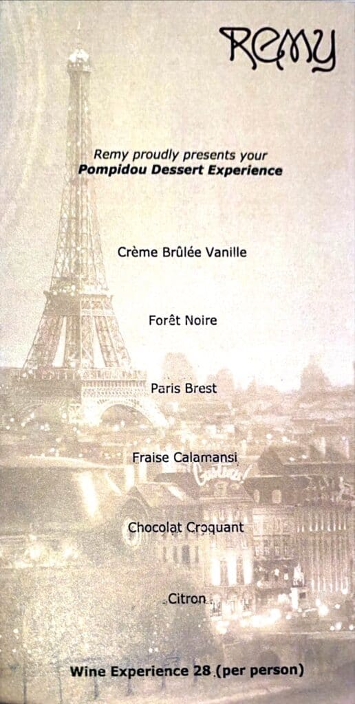 Disney Cruise Line describes the Pompidou Remy Dessert experience as “Treat your taste buds to a delectable 5-course dessert menu served with coffee. This adults-only event features an in-depth discussion with Remy’s Executive Chef and Pastry Chef, who will take turns explaining the history and evolution of each sweet selection.” Since we had never done this before on our previous cruises, we decided to try it. We booked it for our second sea day.