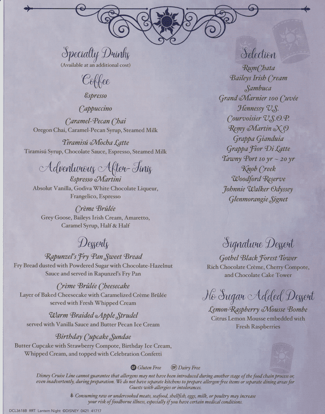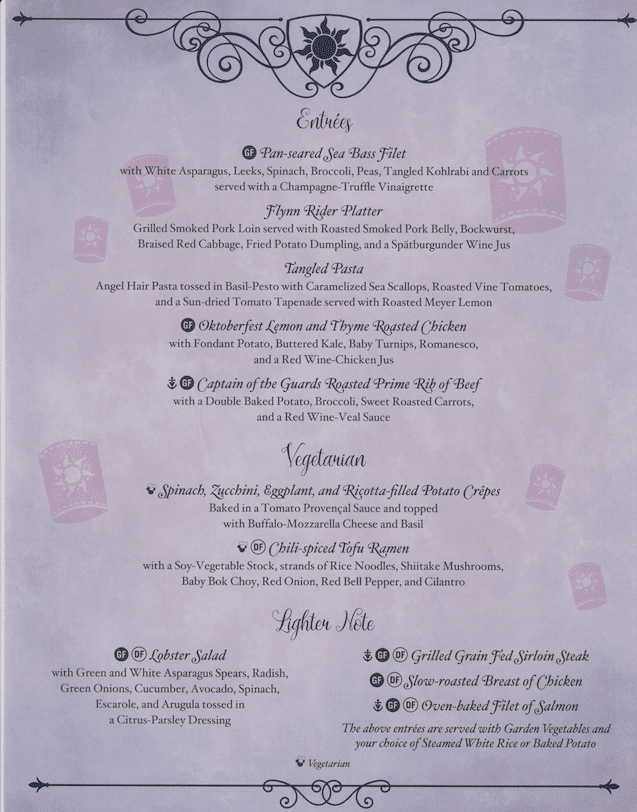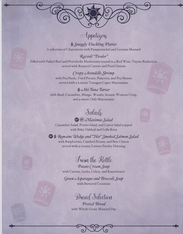 During a recent February 2025 5-night Western Caribbean cruise on the Disney Magic from Galveston, Texas, we were able to confirm that our menus for Rapunzel’s Royal Table are still current. We’ve included pictures of the menu and food in this post. Some of the items are from this cruise and some are the same items from various other sailings.