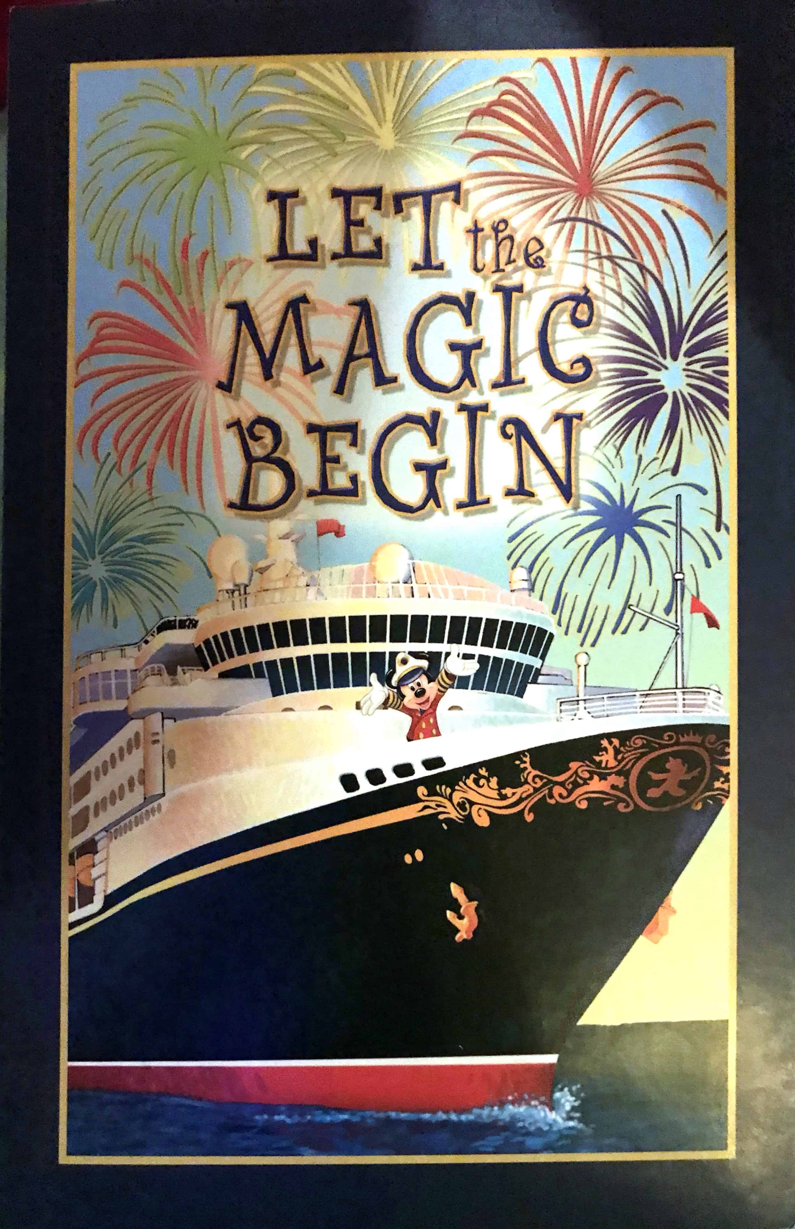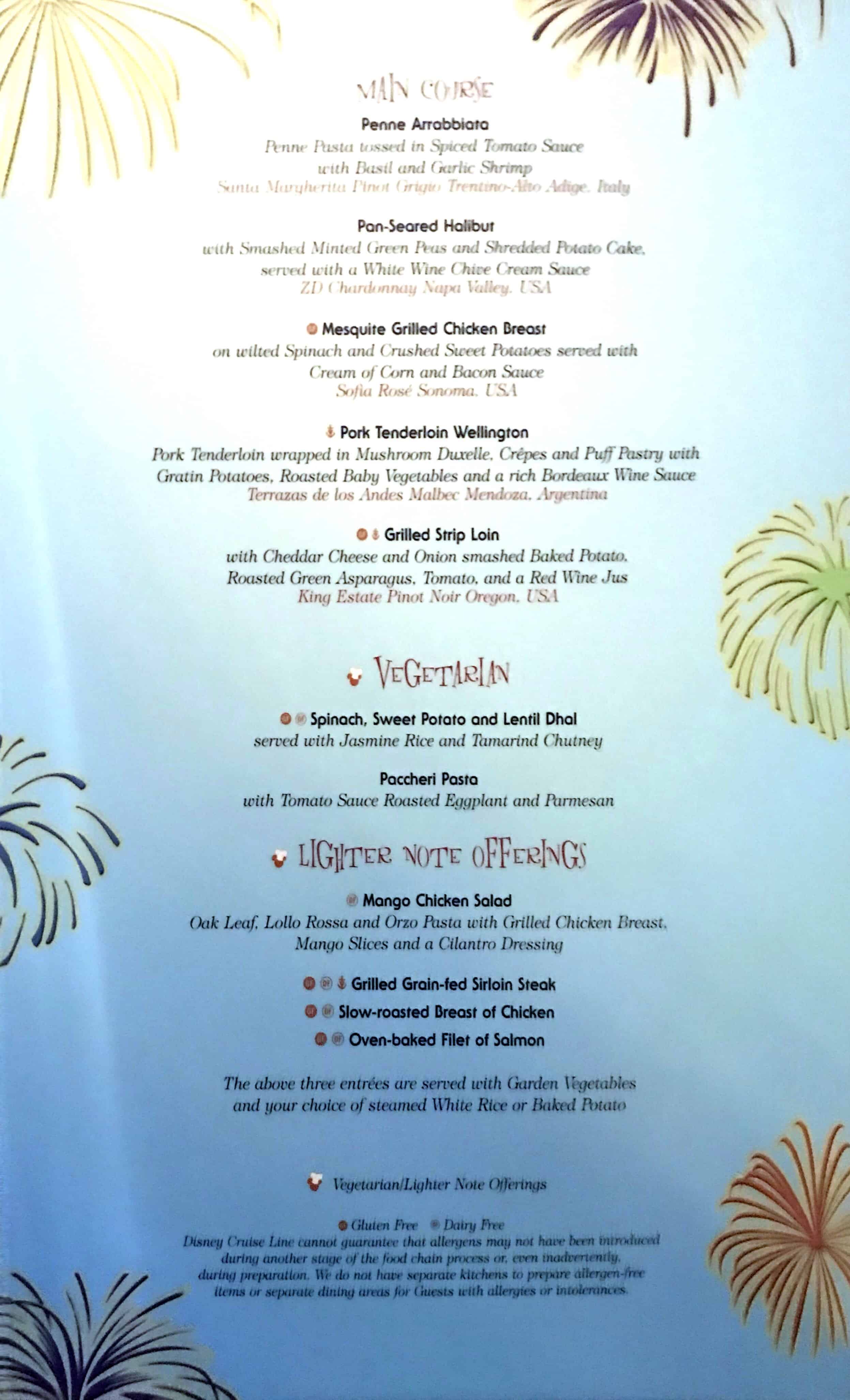 Here is the menu and some food pictures from the Disney Wonder Let The Magic Begin dinner. This was featured on the first night of a recent five night cruise that we took. (We were in Tiana’s Palace that night so the menu cover is from that restaurant).