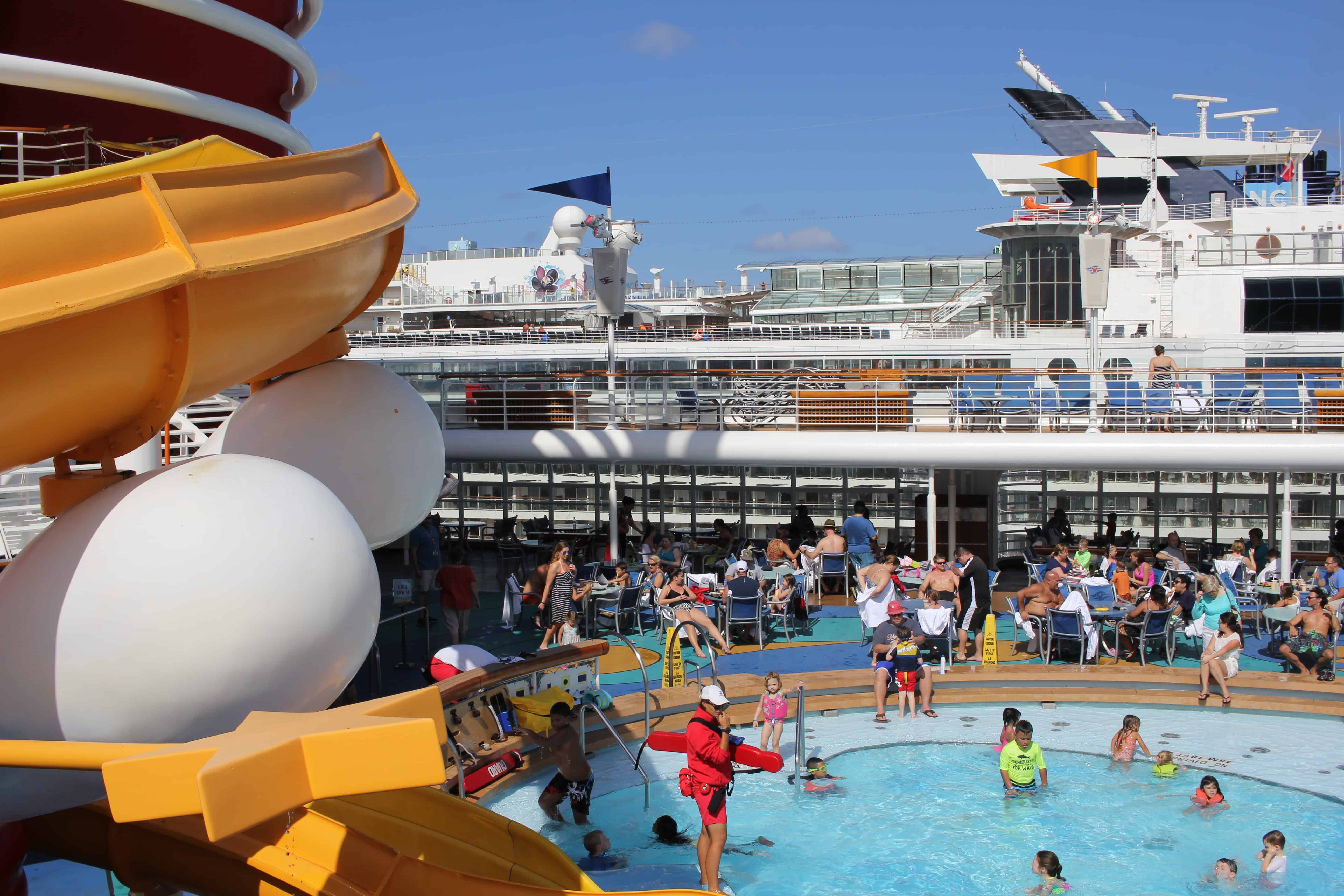 We woke up the next day with the boat docked in Nassau. Since we didn’t plan on going into the town, we slept in a bit late. One of the girls LOVES the french toast served at Beach Blanket, the buffet served on Deck 9. We headed up there for breakfast, then staked out some chairs on the pool deck. We settled in to let the girls swim in the pools. Nancy and I relaxed and watched movies on the Funnel Vision. The older girl decides now is the time to tell us that they have soft pretzels at the pizza place on Deck 9. As a family, we love Disney pretzels with a passion. This was our third cruise and we were just now finding out about the free pretzels!!! So, needless to say, we stuffed ourselves stupid with them.