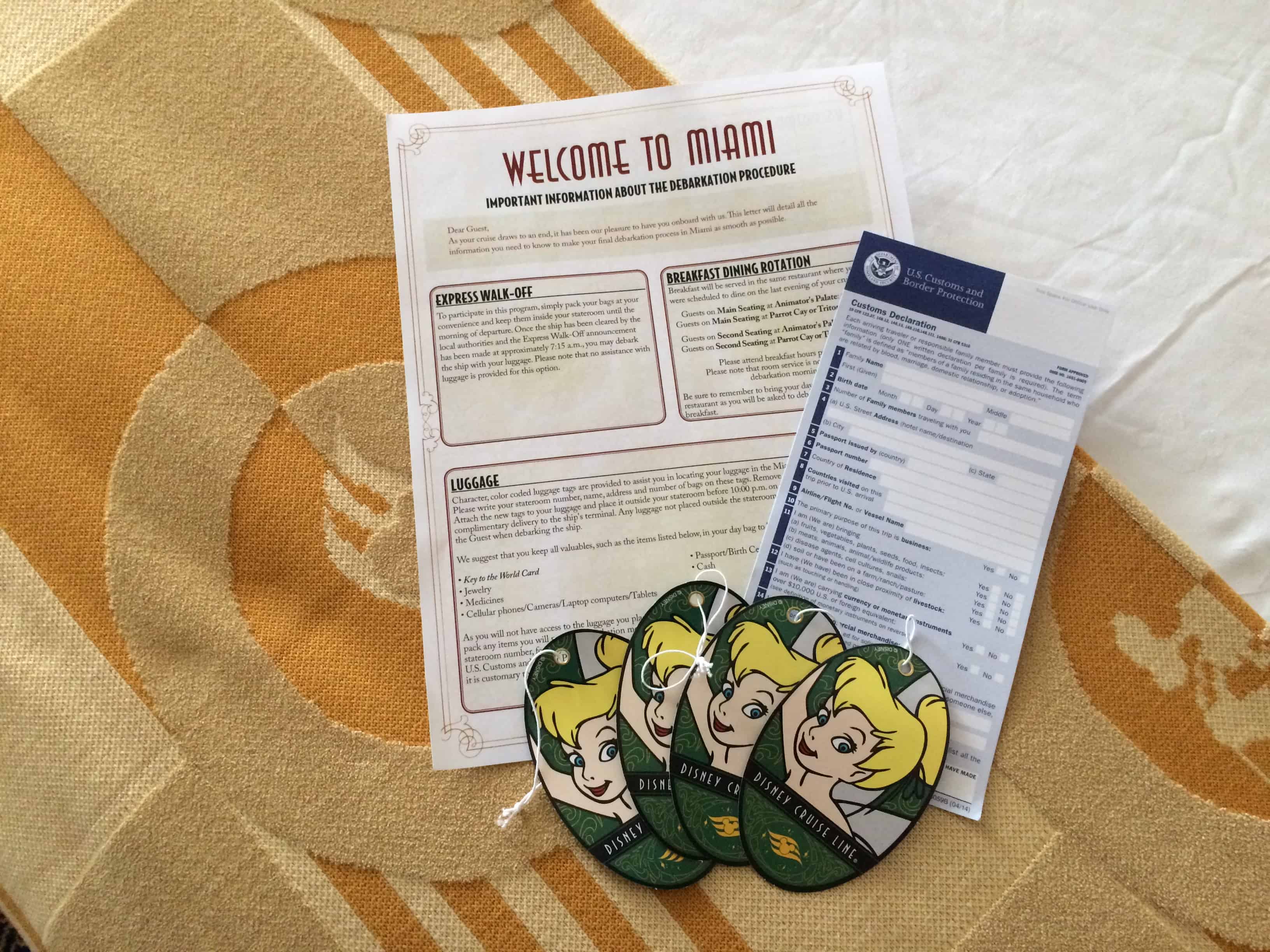 We always refer to the last morning of the cruise as the saddest day. You receive your debarkation information the night before. This includes a letter explaining the process, luggage tags, and a form for customs. You need to gather your suitcases together and place them outside your room before 10:00 PM with the luggage tags attached, making sure you keep a few important items with you, including your Passports, a change of clothes, and anything you need for the last night on board the ship. Of course, you can also keep all your luggage with you and carry it off the ship the next morning yourself (without assistance).