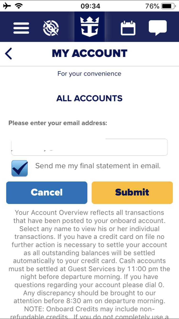 The app also allows you to enter your email address so you can get your final onboard account balance (and all transactions) sent to you after you have left the ship.