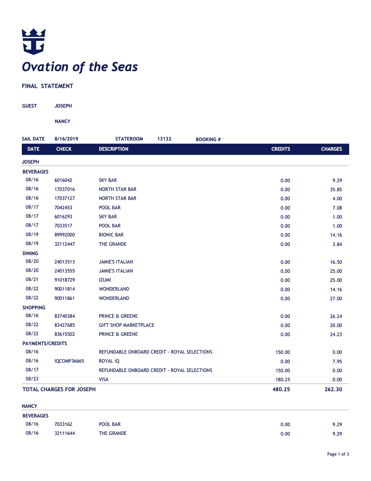 On the first page of this bill are my charges followed by two of Nancy’s (which continued onto the next page). As you can see, I had a number of charges from various bars around the ship. They don’t differentiate the charges for the beverages from the gratuities that we added (in addition to the automatic 18% gratuity that is added). I also had the gratuities that we added at the specialty dining places, but not the charges for the meal itself. We paid for those up front by purchasing a four night specialty dining package. Some of the other charges for the specialty dining were from alcoholic beverages that we purchased in those restaurants. There were also charges for some shopping that we did while on board. There are a lot of shops on Ovation of the Seas.