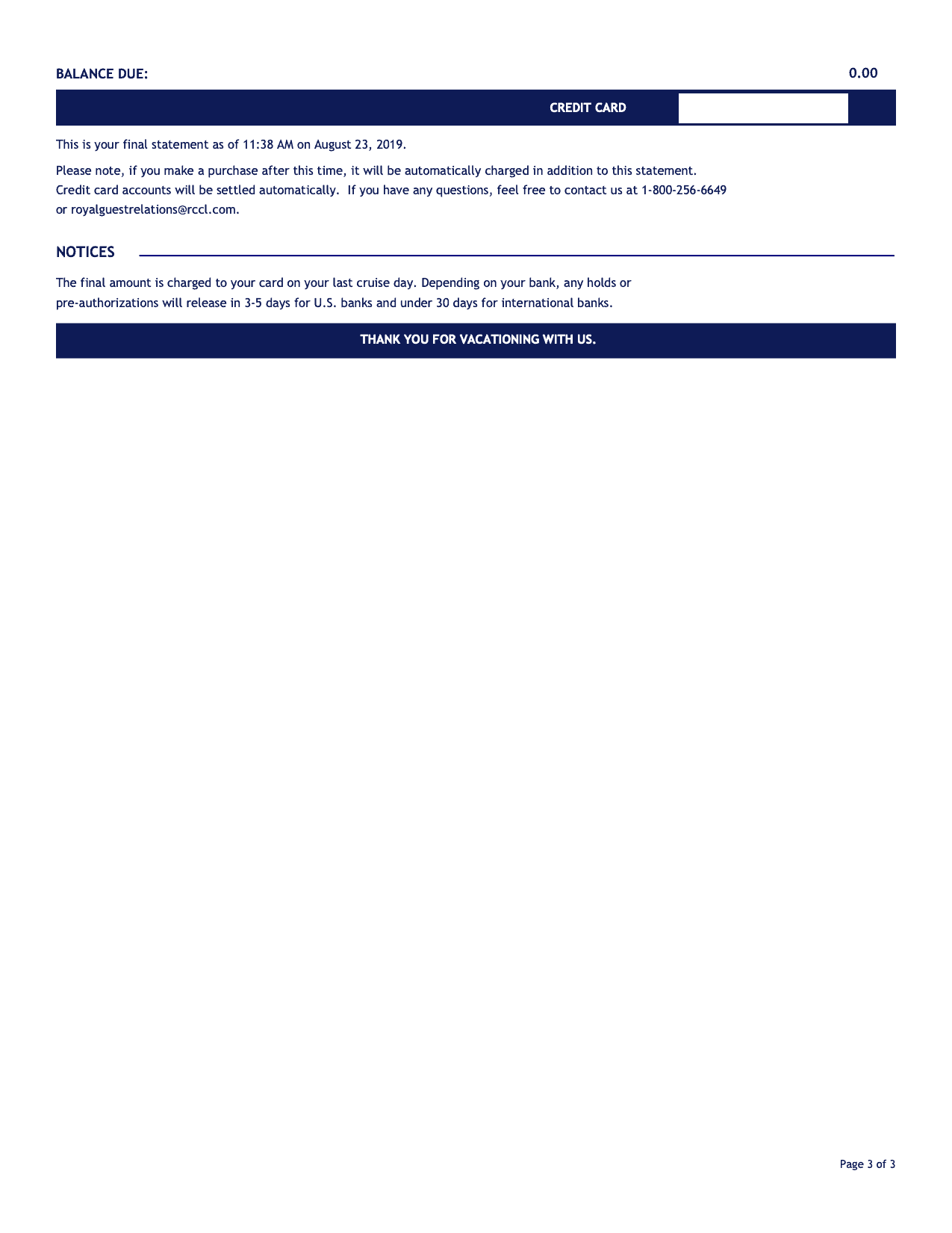 One of the worst aspects of any cruise vacation is the fact that you actually have to pay your final bill! (Just kidding). If you’ve never cruised with Royal Caribbean before, I wanted to share exactly what that final Guest Account Summary will look like once you receive it. This final statement is from our Ovation of the Seas cruise that we took to Alaska. It was waiting for us the morning of disembarkation. You can also go to Guest Services at any point on the cruise to get a printed version of it (for charges up to that point).