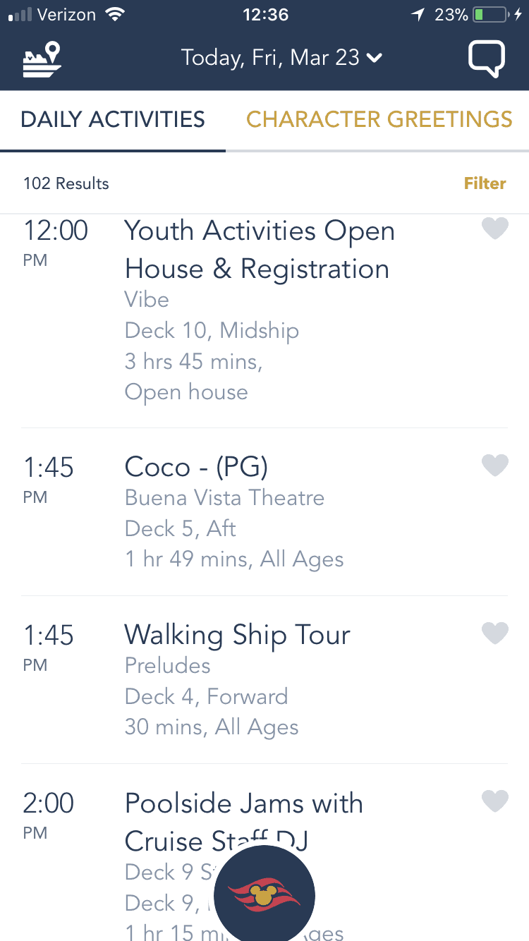 If you select the Disney Cruise Line symbol at the bottom of the activities page, you can get a list of the activities that you selected as a favorite (with the heart symbol). You will also get reminders about these activities on your device.